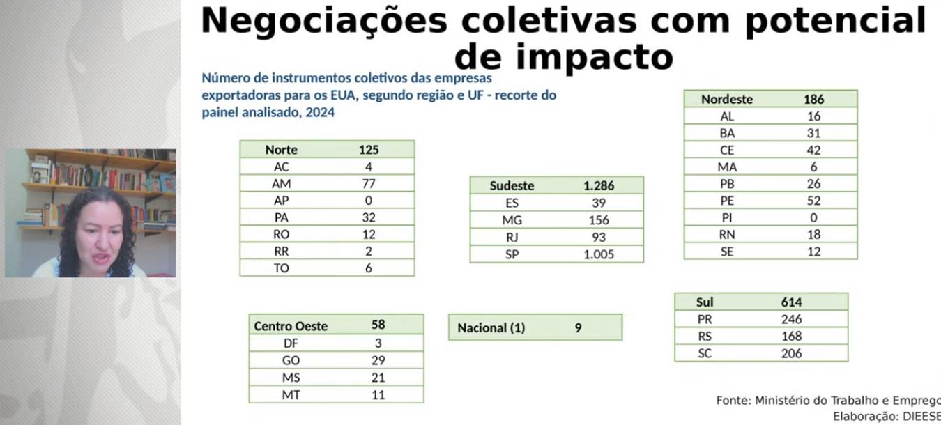 A coordenadora técnica do Dieese, Adriana Marcolino, falou da reorganização das cadeias em nível global e a ampliação das cadeias estratégicas. “Precisamos mitigar os possíveis efeitos do tarifaço”. Segundo Adriana, haverá um peso nas exportações do Brasil para os Estados Unidos. “O teto de impacto de curto prazo – 1 ano – irá se reduzir ao longo do tempo, devido à reorganização dos setores. O impacto no emprego seria de 760 mil. Os setores mais atingidos serão: metalúrgico, madeira e agropecuária.