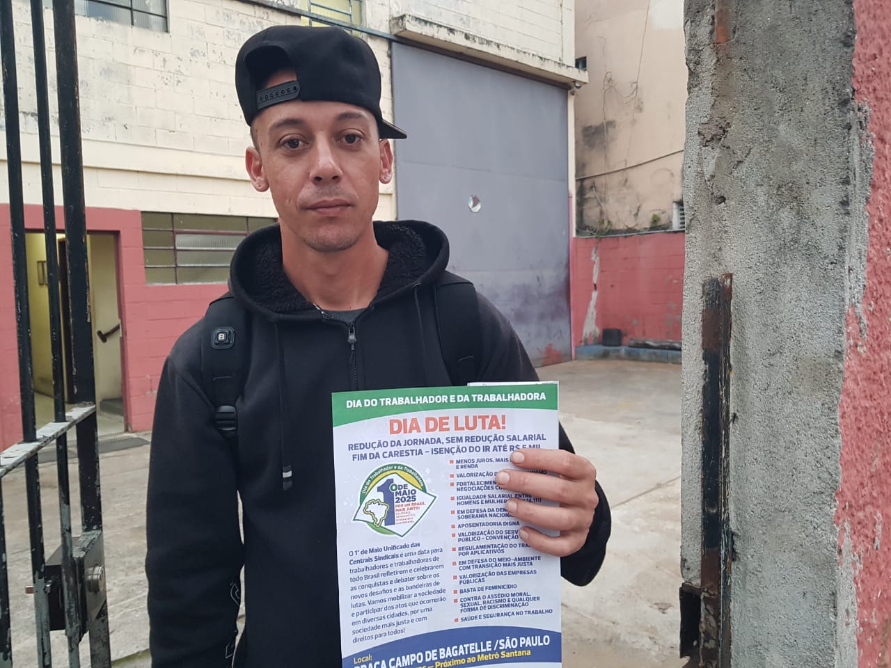 Trabalhador da PBG, base da diretora Ester, com o panfleto de divulgação do 1º de Maio 2025
