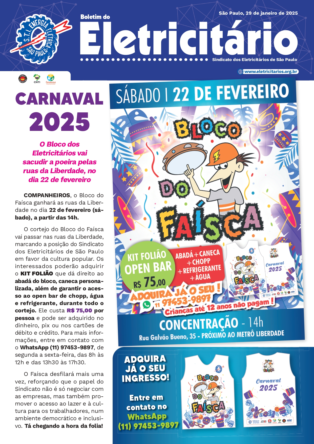 O bloco dos Eletricitários vai desfilar com a participação de outras entidades sindicais, como a Força Sindical, a CNTI (Confederação Nacional dos Trabalhadores na Indústria), a FENATEMA (Federação Nacional dos Trabalhadores em Energia, Água e Meio Ambiente) e a AEASP (Associação dos Eletricitários Aposentados de São Paulo).