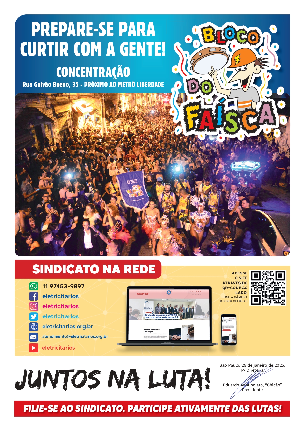 SEM LIBERDADE, NÃO HÁ ALEGRIA! SEM LUZ, NÃO HÁ CARNAVAL! FAÍSCA É ENERGIA! FAÍSCA É LUZ! BLOCO DO FAÍSCA É CARNAVAL! Do movimento sindical às ruas para o Bloco do Faísca.