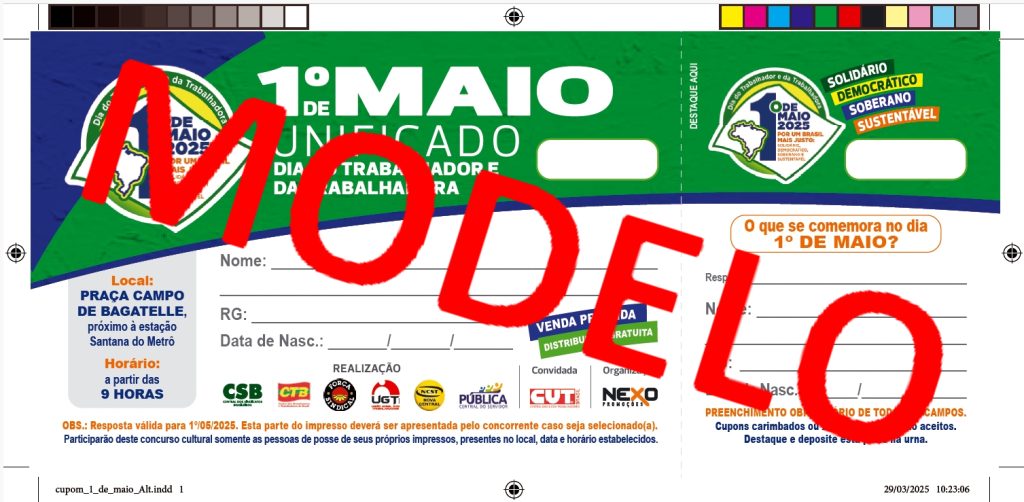 O Dia Internacional do Trabalhador(a) será realizado na quinta-feira, 1º de maio de 2025, na Praça Campo de Bagatelle, zona norte de São Paulo, a partir das 9 horas, com bandeiras de luta, shows gratuitos e sorteios de 10 carros Zero KM Polo Track/Volkswagen. Para participar dos sorteios, é preciso estar presente ao evento e […]
