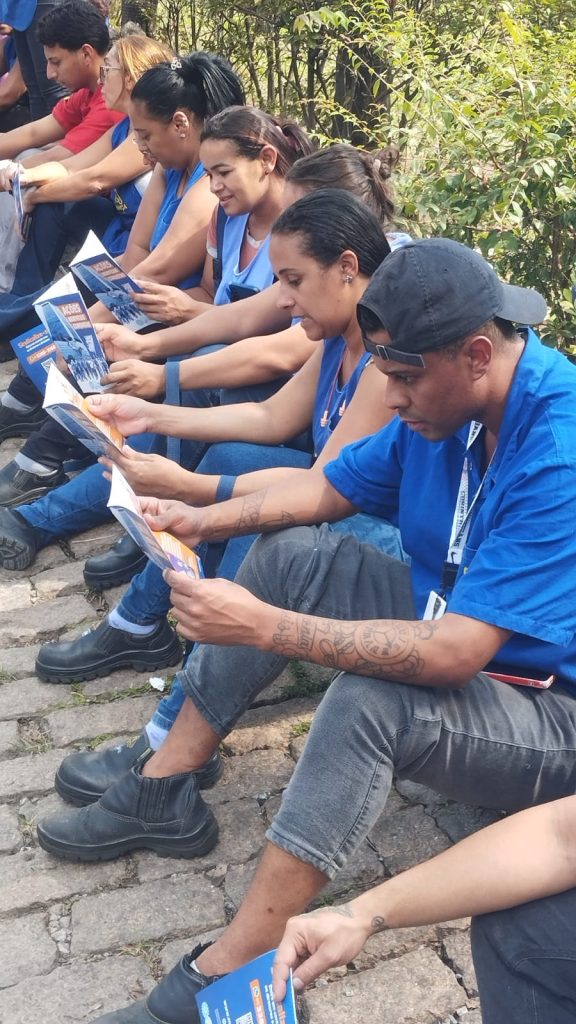 Trabalhadoras e trabalhadores leem o livreto sobre ações, benefícios e conquistas do Sindicato
