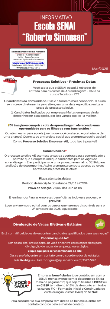 Telefones: 3322-5010/3322-5017 Whatsapp: 97222-7845 relacionamento101@sp.senai.br Débora (coordenação) – Kátia (apoio técnico) – Vanessa (apoio administrativo) SENAI Brás